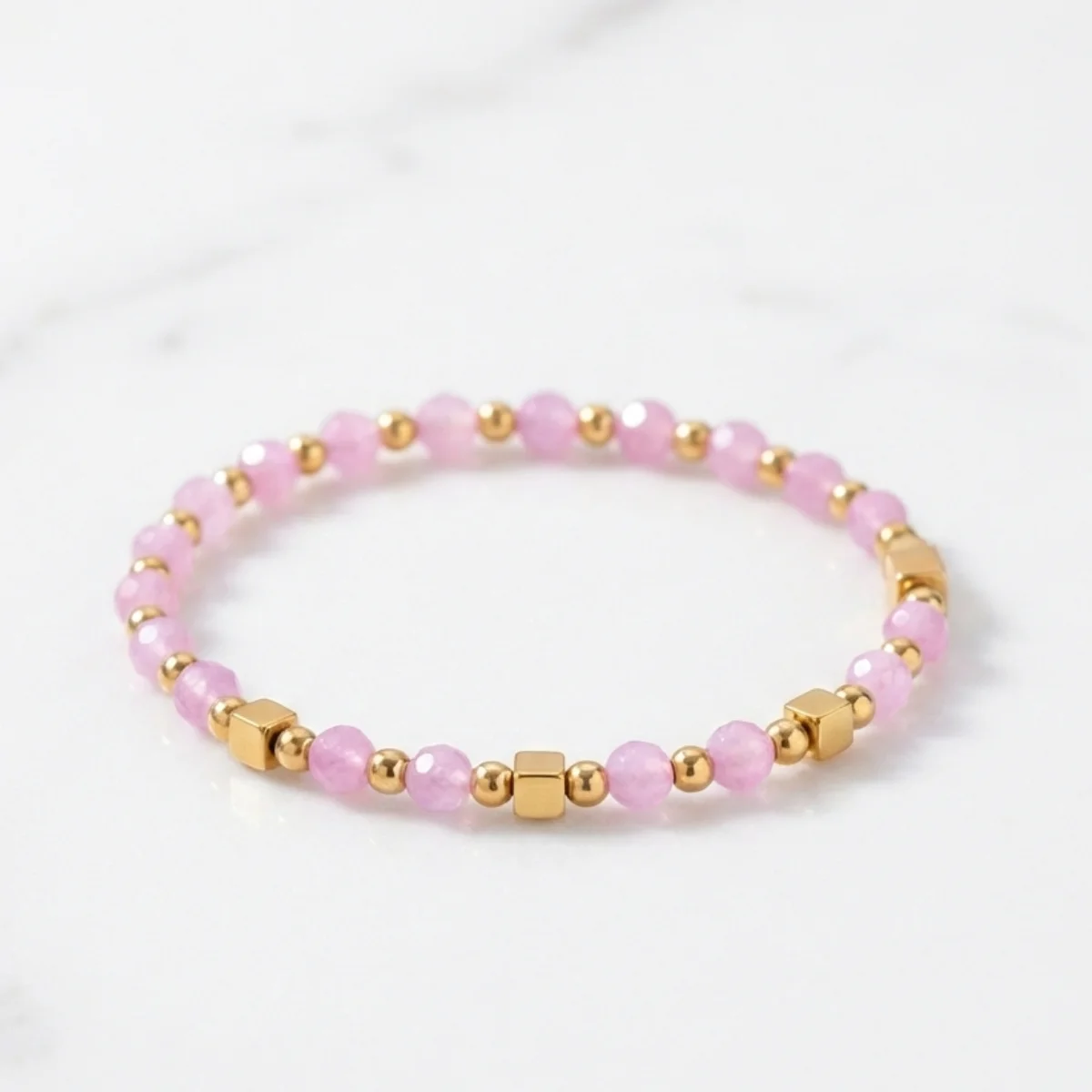 Bransoletka została skomponowana z drobnych (4 mm), fasetowanych koralików w kolorze pastelowego fioletu. Dzięki szlifowanym ściankom, koraliki subtelnie odbijają światło. Projektanci zadbali o nowoczesny twist – w centralnym punkcie umieszczono geometryczne, złote sześciany, które pięknie kontrastują z okrągłymi elementami. Wszystkie metalowe części (kulki, kostki, zapięcie) wykonane są z wysokogatunkowej Stali Szlachetnej (S. Steel). To gwarancja, że bransoletka jest odporna na wodę i nie straci swojego blasku nawet przy codziennym noszeniu.