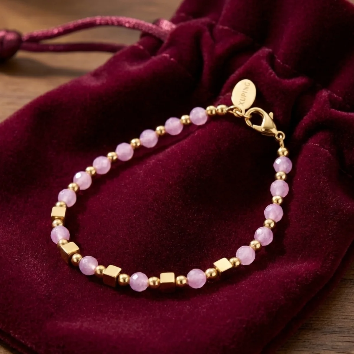 Subtelność w kolorze lawendy. Ta urocza bransoletka łączy fasetowane, fioletowe koraliki z blaskiem złoconej stali szlachetnej. Nowoczesny akcent stanowią geometryczne, złote kostki w centrum. Wodoodporna, trwała i niezwykle kobieca – idealna do wiosennych i letnich stylizacji.