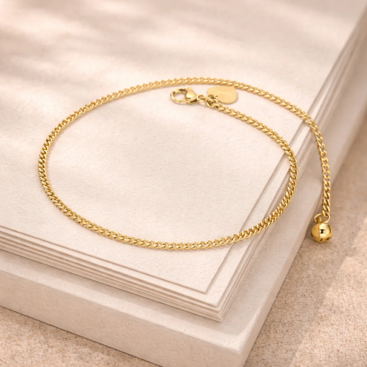 Fundamentem tej bransoletki na kostkę jest gęsty splot pancerka o szerokości 2,5 mm. Jego specyfika polega na tym, że ogniwa są spłaszczone i wypolerowane na błysk. Taki zabieg sprawia, że łańcuszek idealnie płasko przylega do skóry, a jednocześnie tworzy taflę, od której rewelacyjnie odbijają się promienie słoneczne. Charakteru dodają jej dyskretne, radosne akcenty ukryte tuż przy zapięciu: serce o promienistej fakturze i kuleczka przypominająca drobny dzwoneczek.