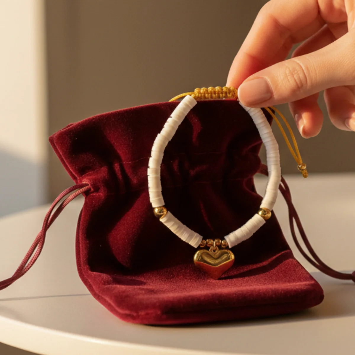 Design opiera się na kontraście. Matowe, białe dyski Heishi stanowią idealne tło dla luksusowego błysku złota. Centralny element – wypukłe serce – oraz ozdobne kuleczki wykonane są z trwałej Stali Szlachetnej. To połączenie sprawia, że bransoletka jest nie tylko modnym gadżetem, ale eleganckim dodatkiem, który założysz zarówno do bikini, jak i do wieczorowej, białej sukienki.