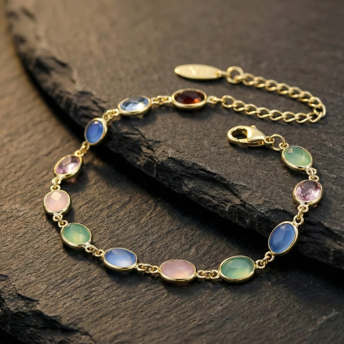 Słodka jak pudełko landrynek. Ta radosna bransoletka to energetyczny miks kolorów i faktur. Znajdziesz tu pastelową miętę, pudrowy róż, chłodny błękit i ciepły bursztyn. Kamienie osadzone są w bezpiecznych, pełnych oprawach, a całość pokryta jest złoceniem 14K. Idealny sposób na poprawę humoru i ożywienie każdej stylizacji.