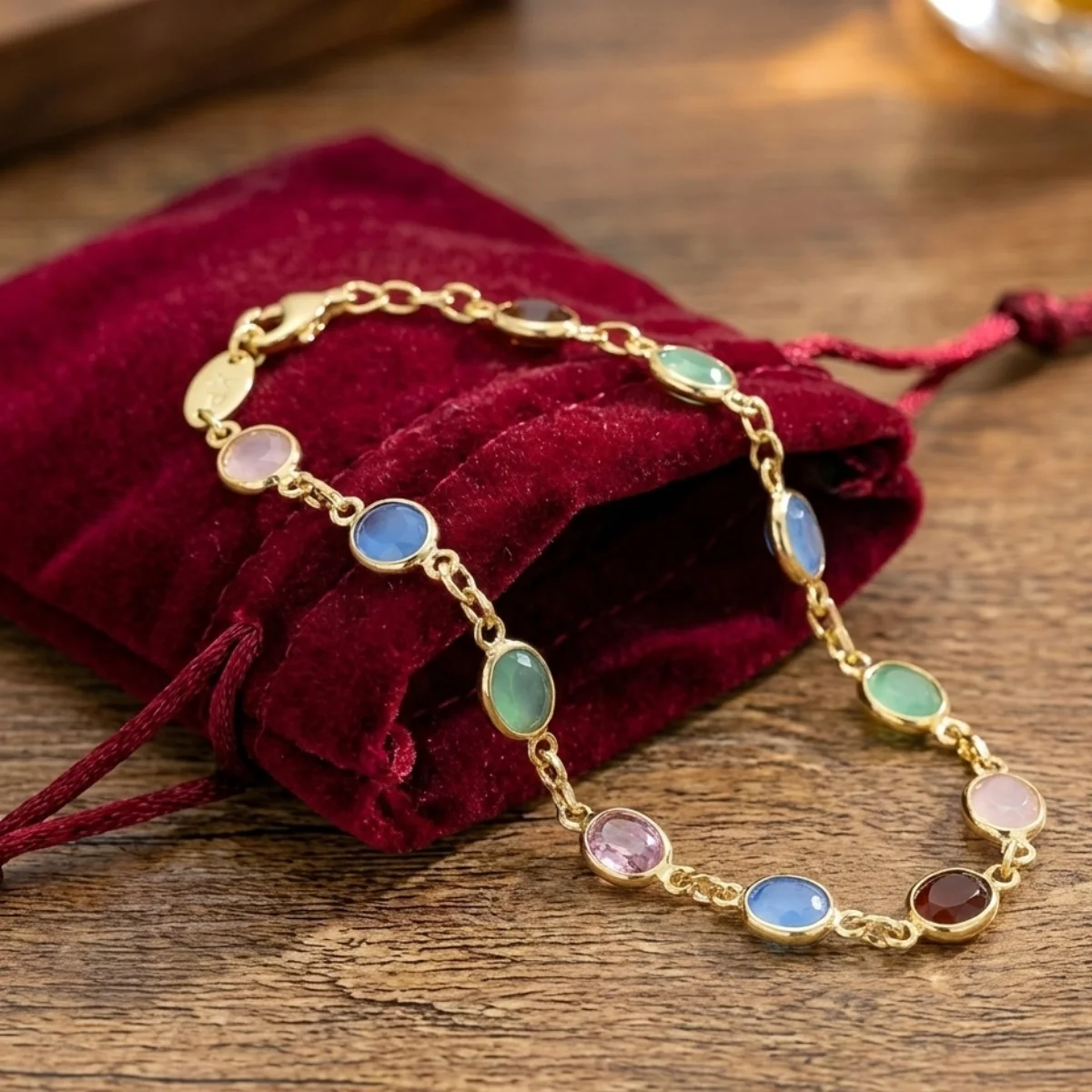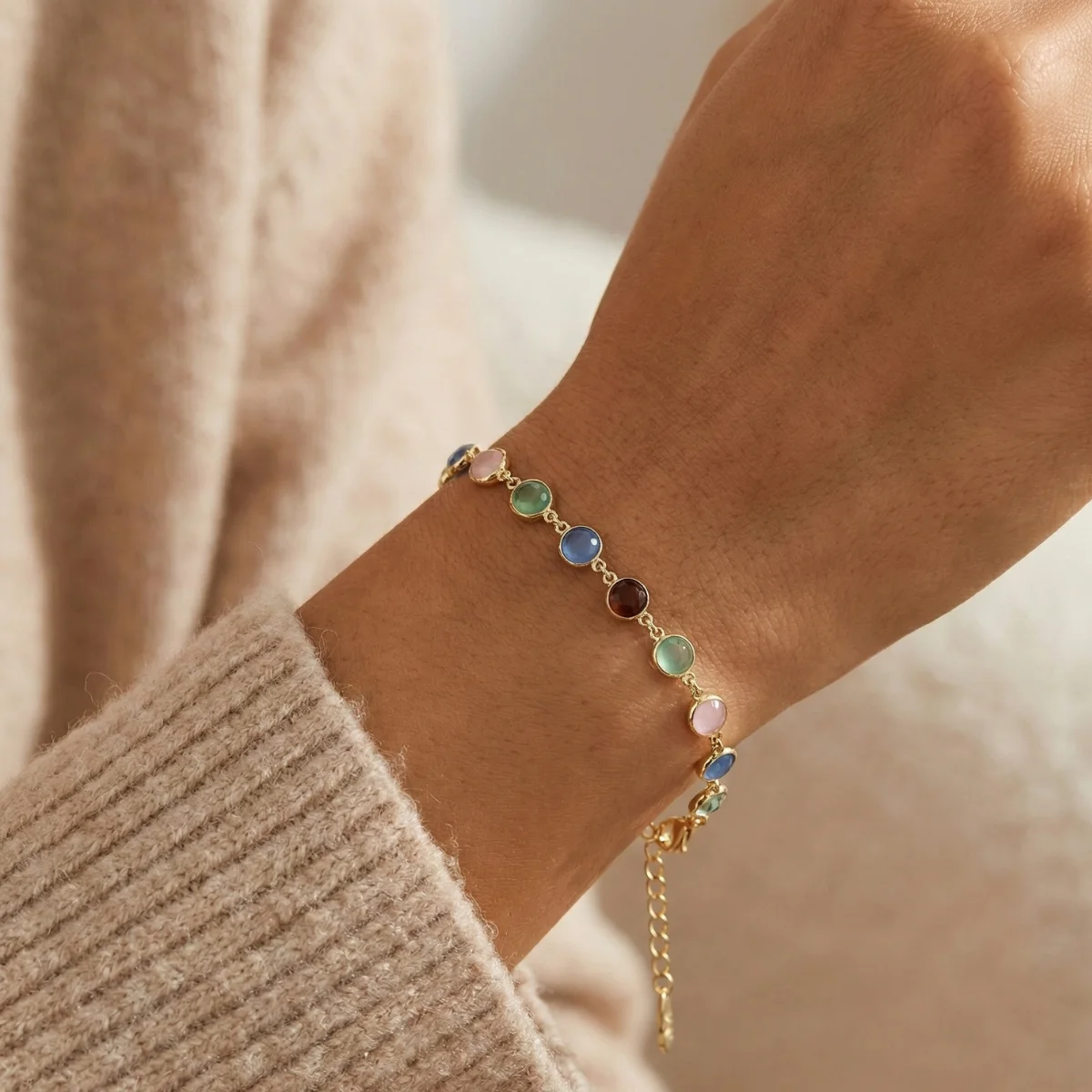 Gładka Oprawa (Bezel): Każdy kamień (o średnicy 7 mm) jest otoczony złotą ramką. To nie tylko wygląda estetycznie, ale sprawia, że bransoletka jest gładka w dotyku i nie zaciąga delikatnych materiałów (np. jedwabnych bluzek).