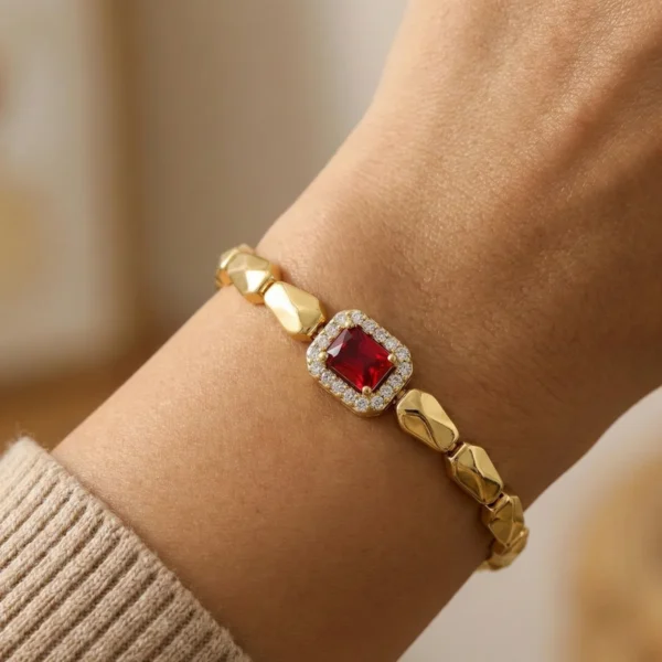 Klasyka godna królowej. Ta wyjątkowa bransoletka zachwyca centralnym kryształem w kolorze głębokiego rubinu, oszlifowanym w prostokątny kształt „Emerald Cut”. Kamień otoczony jest aureolą cyrkonii i połączony solidnymi, złotymi ogniwami. To biżuteria wieczorowa, która nadaje kreacji szlachetnego, wytwornego charakteru.