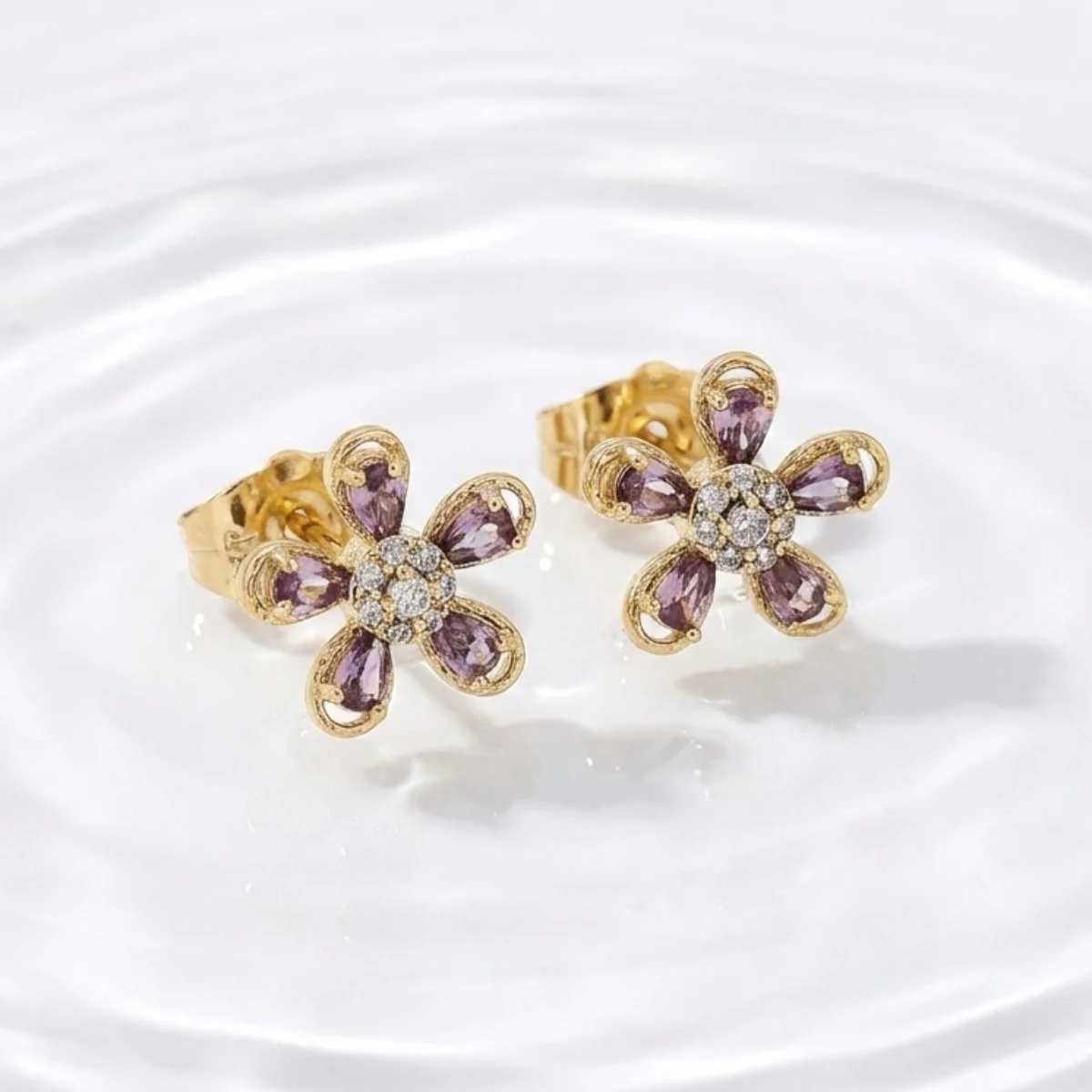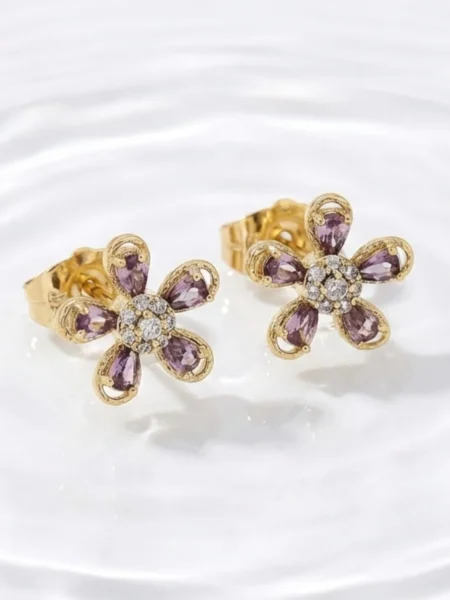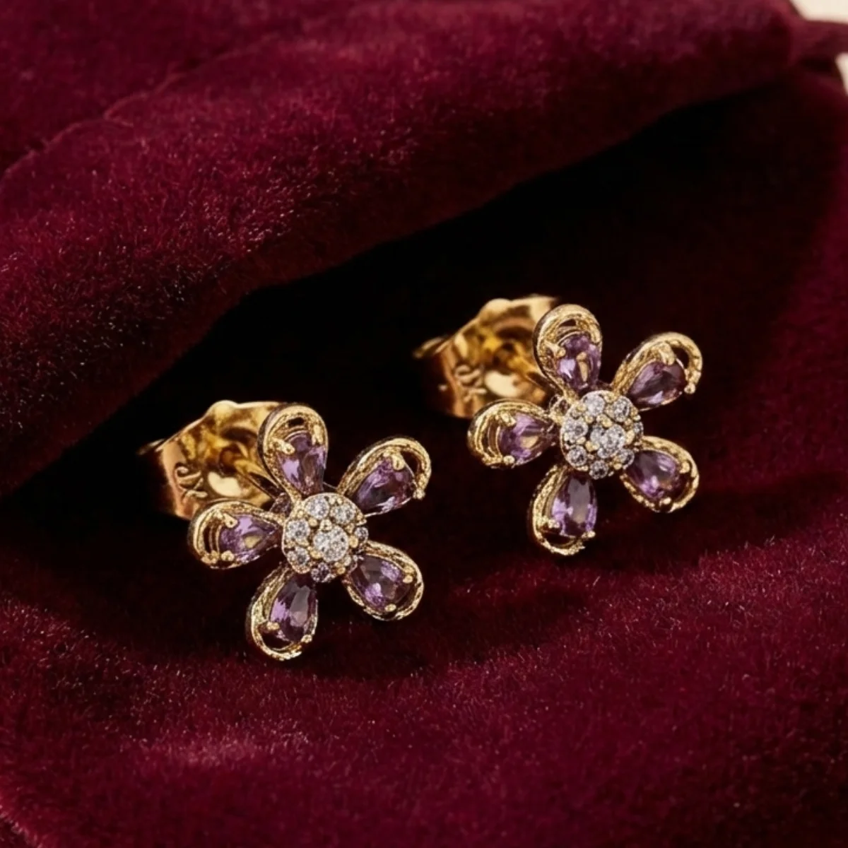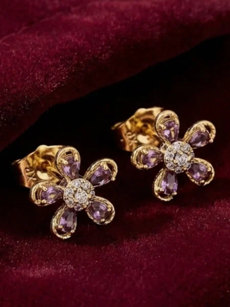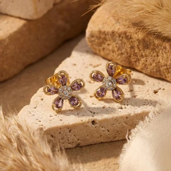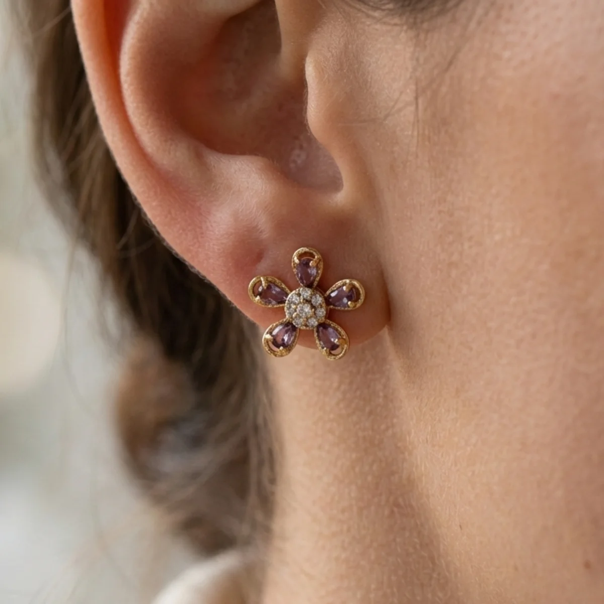 Sercem projektu jest starannie skomponowana margerytka. Jej płatki to sześć cyrkonii o niezwykle szlachetnym, ametystowym odcieniu, wyszlifowanych w kształt delikatnych łezek. Aby kwiatek zyskał głębię i prawdziwy, jubilerski blask, jego środek wypełniono jasnymi mikrokryształkami. Całość osadzona jest w precyzyjnej, złotej oprawie, która przepuszcza światło, maksymalnie potęgując lśnienie kamieni. Dzięki niewielkim wymiarom (11 mm) kolczyki idealnie przylegają do płatka ucha, gwarantując pełen komfort noszenia przez cały dzień.