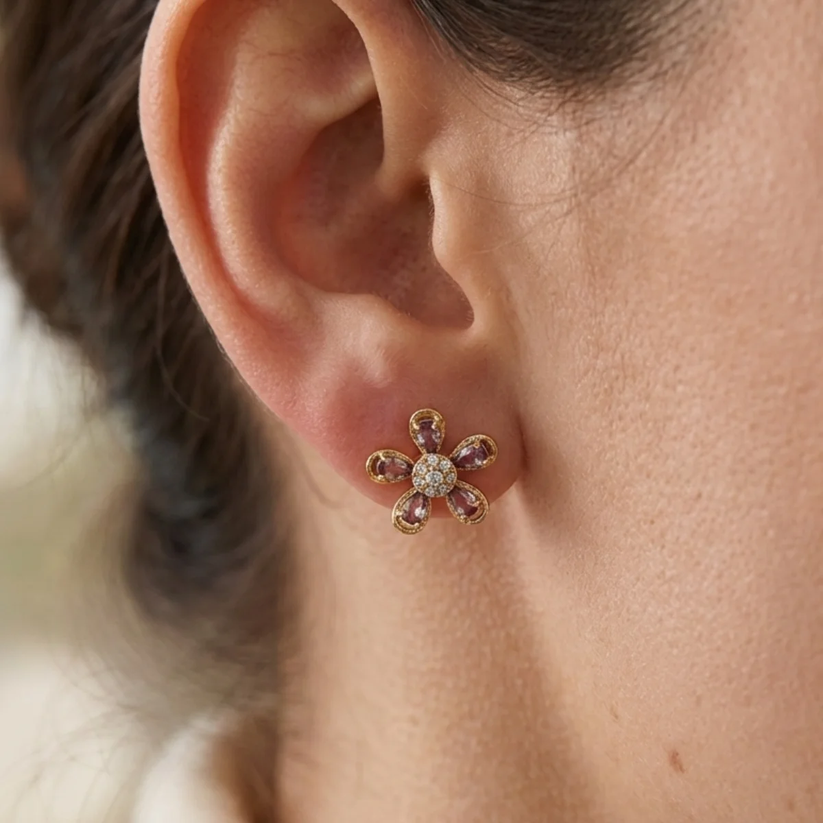 Kształt kolczyka to urocza margerytka, której płatki zostały wykonane z lśniących cyrkonii w odcieniu ciepłego, pudrowego różu. Zastosowanie szlifu w kształcie łezki (Pear Cut) sprawia, że światło miękko załamuje się na krawędziach kamieni, nadając im głębi. Prawdziwego, jubilerskiego blasku dodaje centralny punkt kwiatu – skupisko drobnych, bezbarwnych kryształków. Dzięki kompaktowym wymiarom (11 mm), kolczyki są niezwykle wygodne. Przylegają gładko do płatka ucha, dzięki czemu możesz nosić ten uroczy detal od porannej kawy aż po wieczorny relaks.