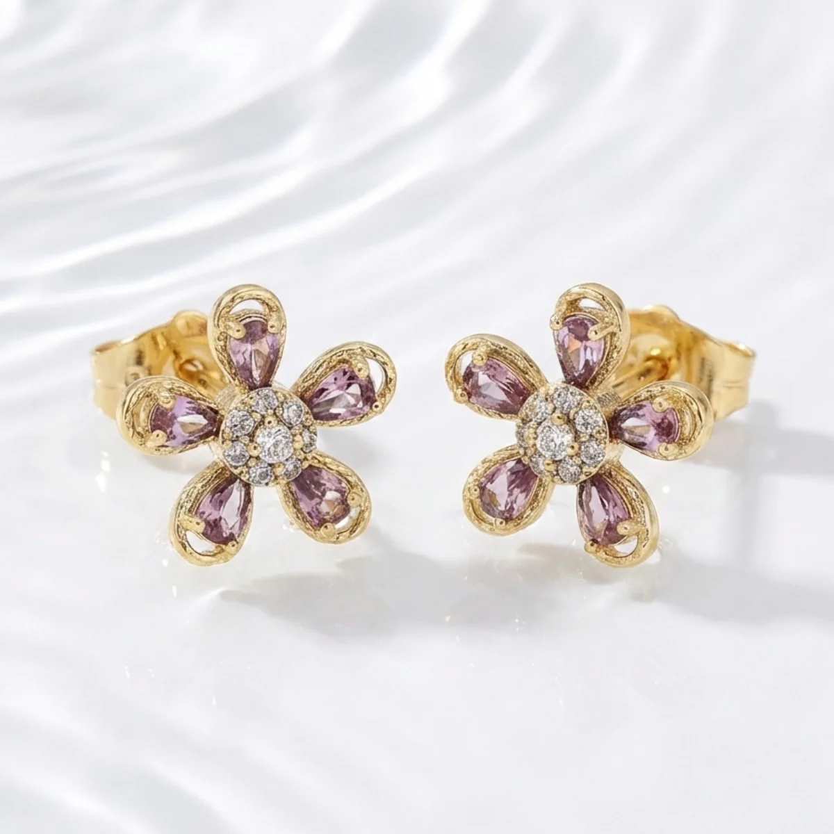 Dodaj swojej stylizacji odrobinę słodyczy. Te filigranowe kolczyki (11 mm) w kształcie kwiatów zachwycają płatkami w kolorze pudrowego różu. Lśniące cyrkonie o szlifie łezki oraz jasny, diamentowy środek tworzą kompozycję pełną wdzięku. To idealny, romantyczny akcent, który podkreśli Twoją kobiecość każdego dnia.