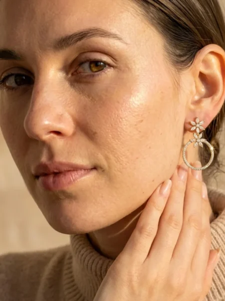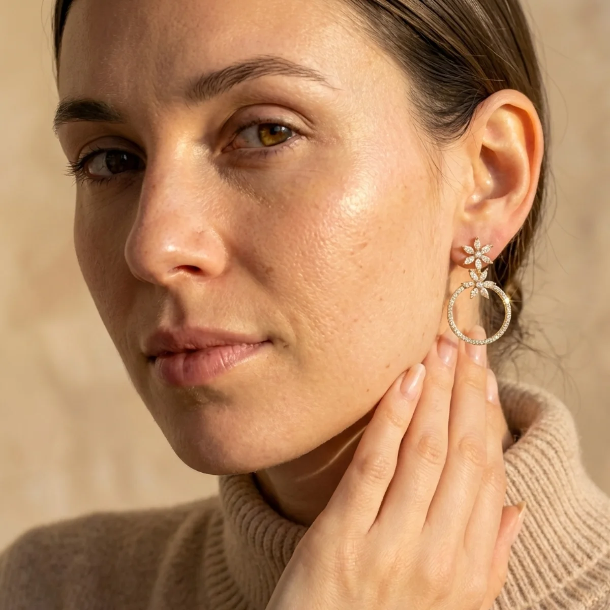 Konstrukcja kolczyka jest przemyślana w każdym calu. Górna część to kwiatowa rozeta przy uchu, która stanowi bazę zapięcia. Od niej odchodzi duży, lśniący okrąg, gęsto wysadzany drobnymi cyrkoniami. Wewnątrz okręgu zawieszono drugi, bliźniaczy kwiat. Największym atutem tych kolczyków są kamienie o szlifie Marquise (Markiza). Ich wydłużony, wrzecionowaty kształt idealnie imituje naturalne płatki kwiatów i odbija światło znacznie intensywniej niż klasyczne, okrągłe dżety.