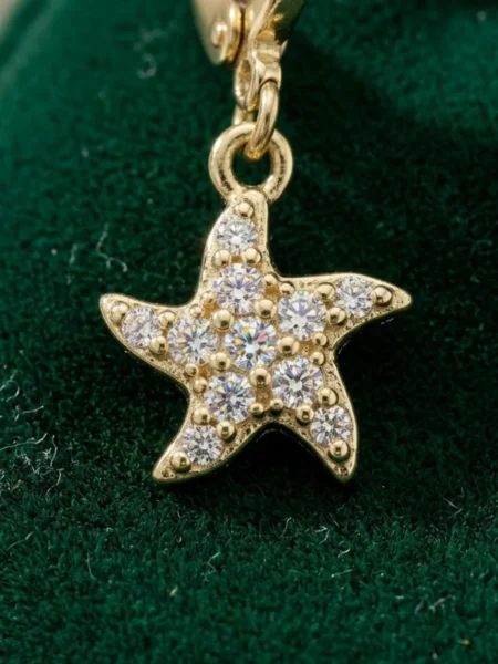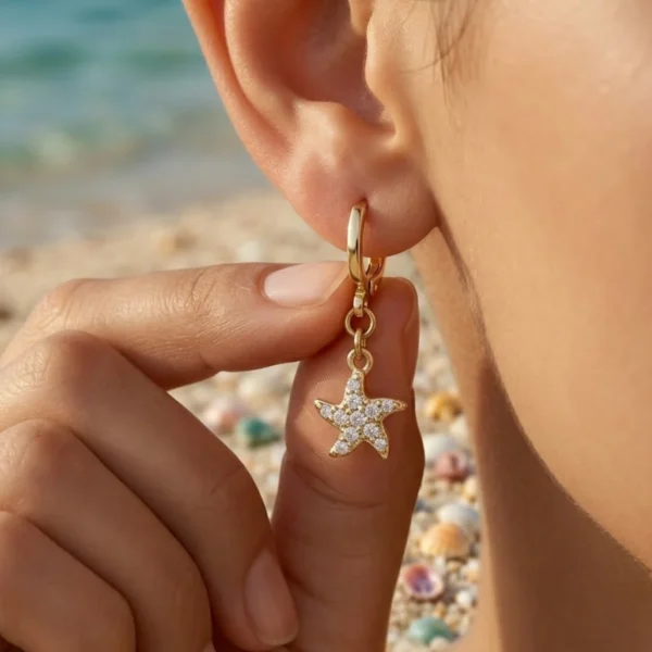 Konstrukcja kolczyka opiera się na niezawodnym kółeczku z ukrytym zatrzaskiem, które miękko otula płatek ucha. Poniżej zawieszono główny atut projektu – misternie wykonaną rozgwiazdę. Jej ramiona zostały precyzyjnie usiane drobnymi, krystalicznymi cyrkoniami. Dzięki temu, że element ten swobodnie zwisa (długość całkowita to 27 mm), kolczyki reagują na każdy Twój ruch, rzucając świetliste refleksy. Szlachetne złocenie o próbie 14 karatów gwarantuje piękny, ciepły odcień, idealnie współgrający z muśniętą słońcem skórą.