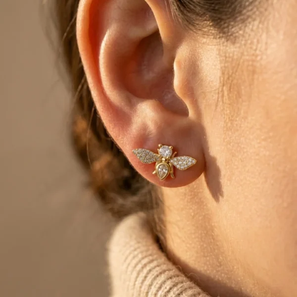 Wygodne Zapięcie: Kolczyki są sztyftami, co sprawia, że pszczółka stabilnie „siedzi” na płatku ucha i nie przekręca się, dumnie prezentując swoje skrzydła.