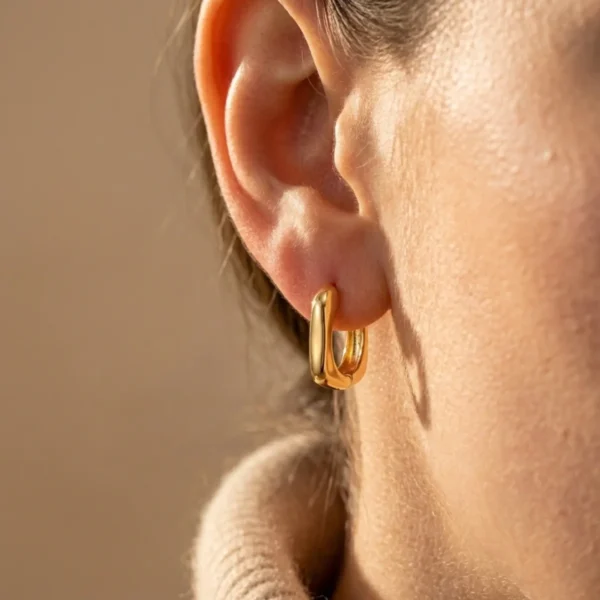 Tym, co przyciąga wzrok, jest kształt kolczyków. Zamiast idealnego okręgu, projektanci postawili na formę „Soft Square”, czyli kwadratu o miękkich, zaokrąglonych rogach. Dzięki temu kolczyki wyglądają nowocześnie i architektonicznie, a jednocześnie są bardzo delikatne w odbiorze. Szerokość profilu wynosząca 3 mm sprawia, że złota linia jest wyraźna i pięknie lśni przy uchu.
