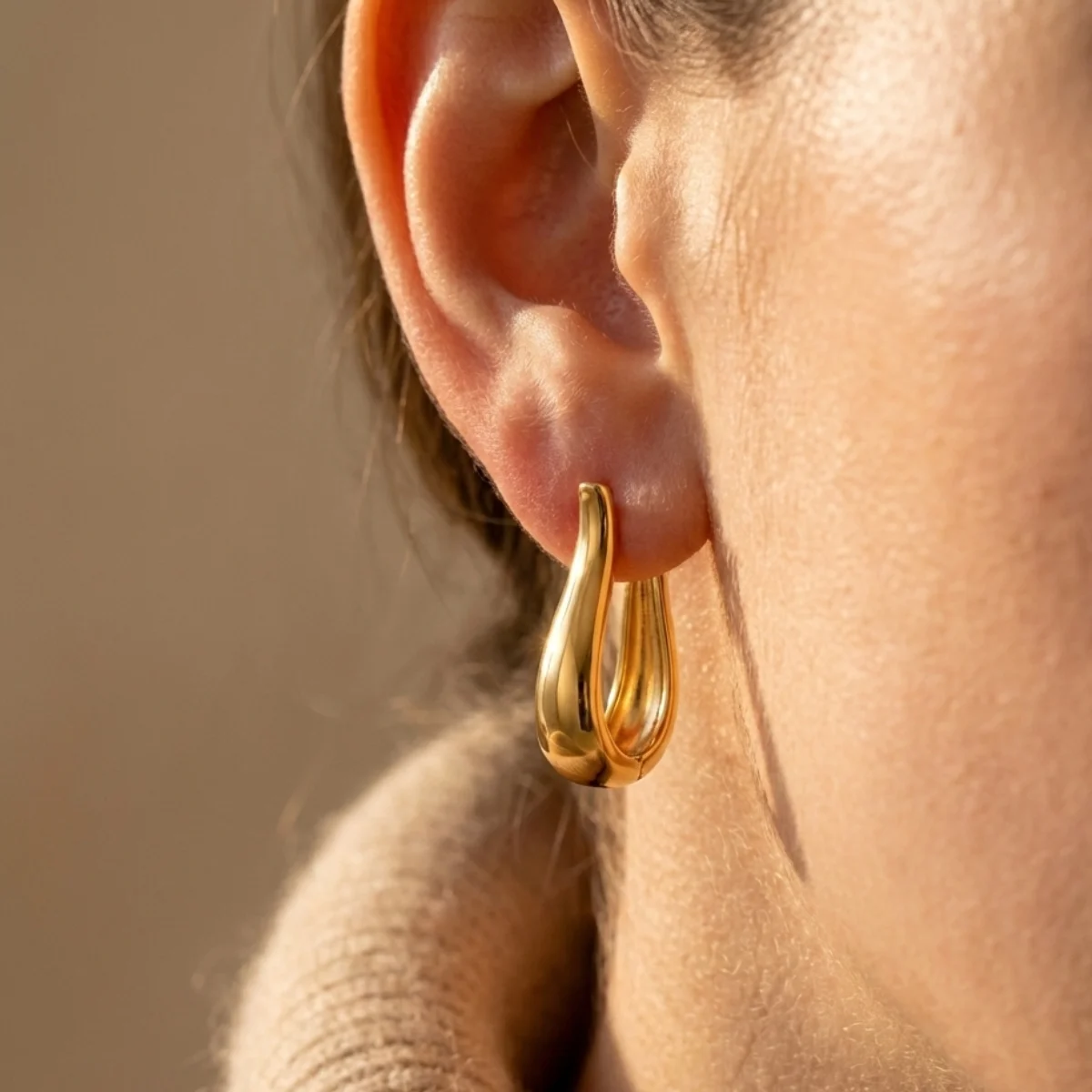 Kolczyki wyróżniają się opływowym kształtem, który rozszerza się ku dołowi do 8 mm. Ta solidna, trójwymiarowa forma sprawia, że kolczyki pięknie odbijają światło całą swoją powierzchnią, dając efekt „mokrego złota”. Są wyraziste i nowoczesne, a jednocześnie nawiązują do klasyki lat 90. Całość zwieńczona jest niezawodnym zapięciem angielskim. Mechanizm ten dyskretnie chowa się za uchem, zapewniając komfort noszenia i pewność, że nie zgubisz swojej ulubionej biżuterii.