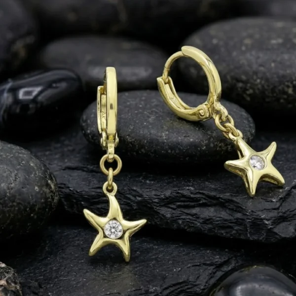 Sercem kolczyków jest swobodnie wisząca zawieszka w kształcie rozgwiazdy. Zamiast gęstego rzędu kamieni, jej powierzchnia to lśniąca, lustrzana tafla pokryta 14-karatowym złotem. W samym środku tego oceanicznego motywu zakuto pojedynczą, krystalicznie czystą cyrkonię, która niczym kropla porannej rosy dyskretnie odbija światło. Dzięki ruchomej konstrukcji o długości 27 mm, kolczyki łapią słońce przy każdym powiewie wiatru, fenomenalnie podkreślając opaleniznę i dodając twarzy promiennego wyrazu.