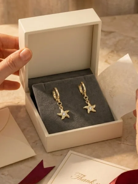 Zadbamy o to, by moment rozpakowania biżuterii był przedsmakiem luksusowych wakacji. Kolczyki wyeksponujemy na gładkiej, czerwonej zamszowej saszetce. Brak krzyczących logotypów pozwoli natychmiast skupić wzrok na szlachetnym lśnieniu złotej rozgwiazdy.