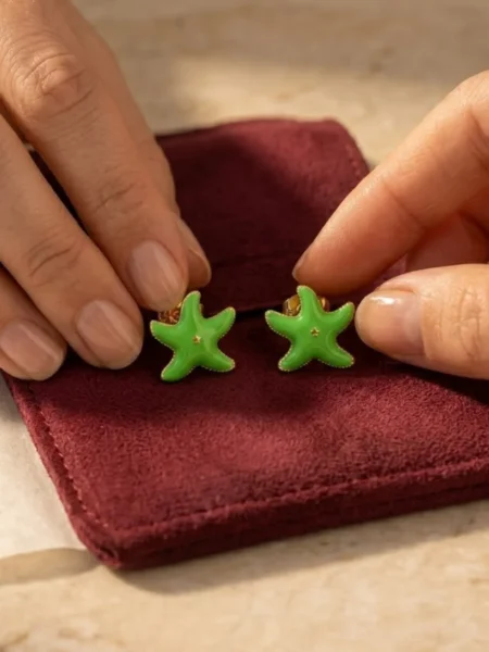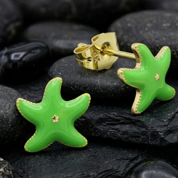 Głównym atutem tych kolczyków jest ich barwa. Filigranowa rozgwiazda (10/11 mm) została precyzyjnie wypełniona emalią w odcieniu intensywnej, tropikalnej zieleni. Ten kolor genialnie współgra z opaloną skórą. Złota gwiazdka umieszczona w samym sercu kolczyka oraz lśniące, pozłacane krawędzie nadają całości trójwymiarowości i eleganckiego szlifu.