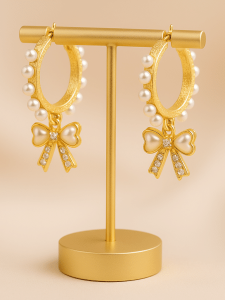 To, co wyróżnia ten projekt, to dbałość o detale. Złota obręcz nie jest zwykłym, gładkim drutem – posiada teksturowaną, „piaskowaną” powierzchnię (Sandblasted Gold), która pięknie kontrastuje z idealnie gładkimi perełkami ułożonymi na jej grzbiecie. Całość wieńczy wisząca zawieszka w kształcie kokardki, wysadzana lśniącymi cyrkoniami, z perłowym sercem w centrum.