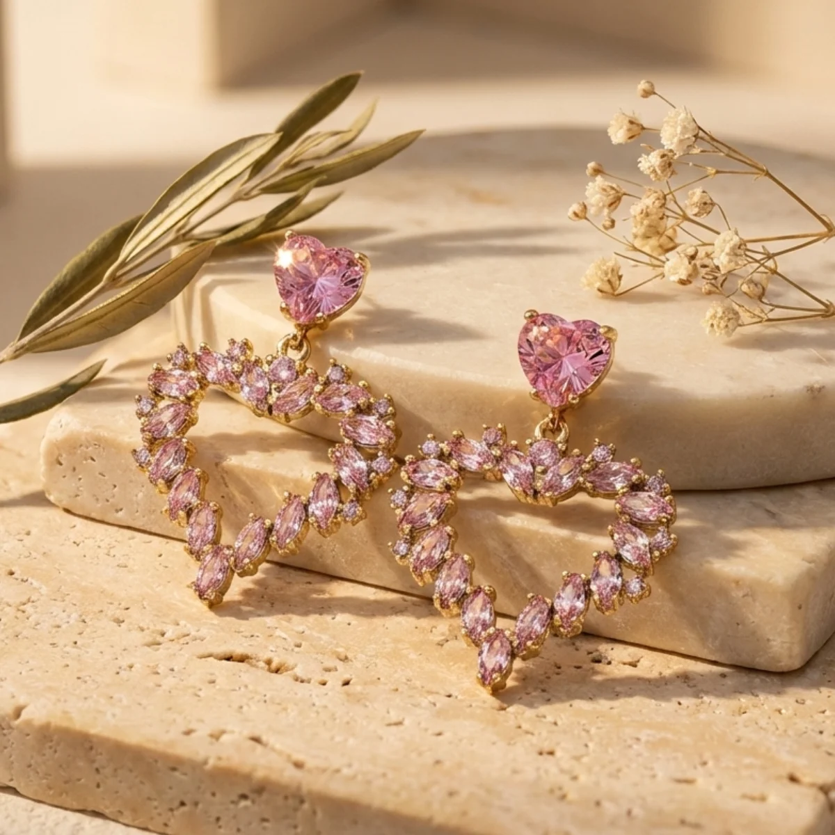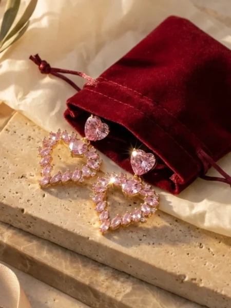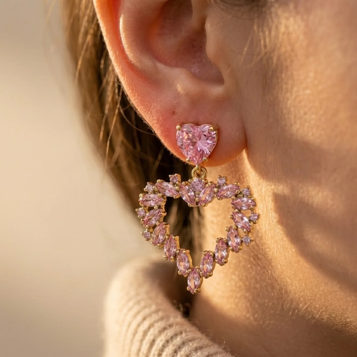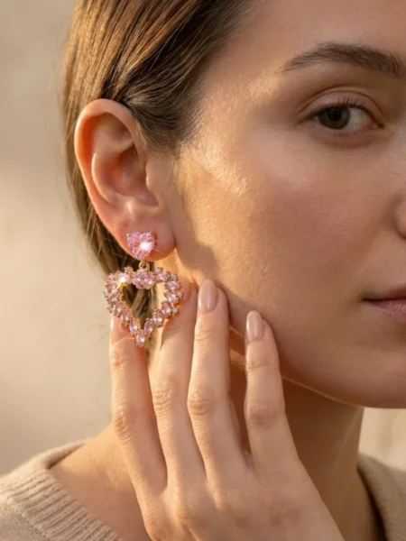 Design opiera się na motywie Podwójnego Serca. Przy uchu znajduje się klasyczny, fasetowany kryształ w kształcie serca, który stanowi bazę zapięcia. Prawdziwa magia dzieje się jednak niżej – na złotym kółeczku zawieszono duże, otwarte serce. Jego kontur został ułożony z różowych cyrkonii o szlachetnym szlifie Marquise (Markiza). Ten wydłużony kształt kamieni sprawia, że serce wygląda jak splecione z delikatnych, lśniących płatków kwiatów.