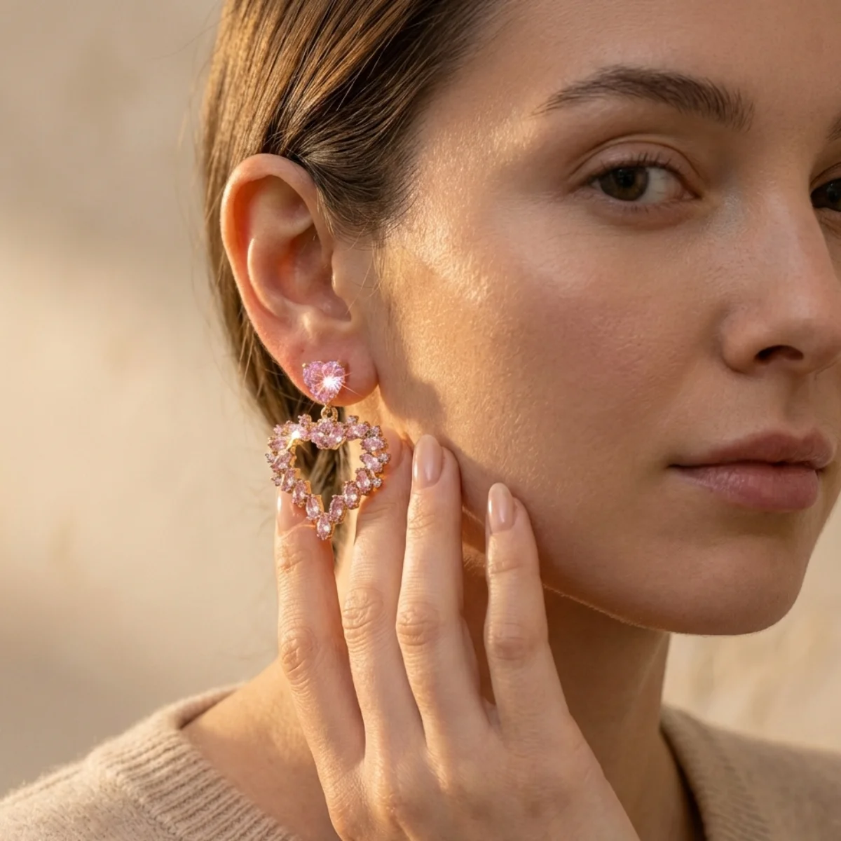 • Efekt „Wow”: Różowe cyrkonie w połączeniu ze złotem to duet, który przyciąga uwagę i pięknie rozświetla cerę.