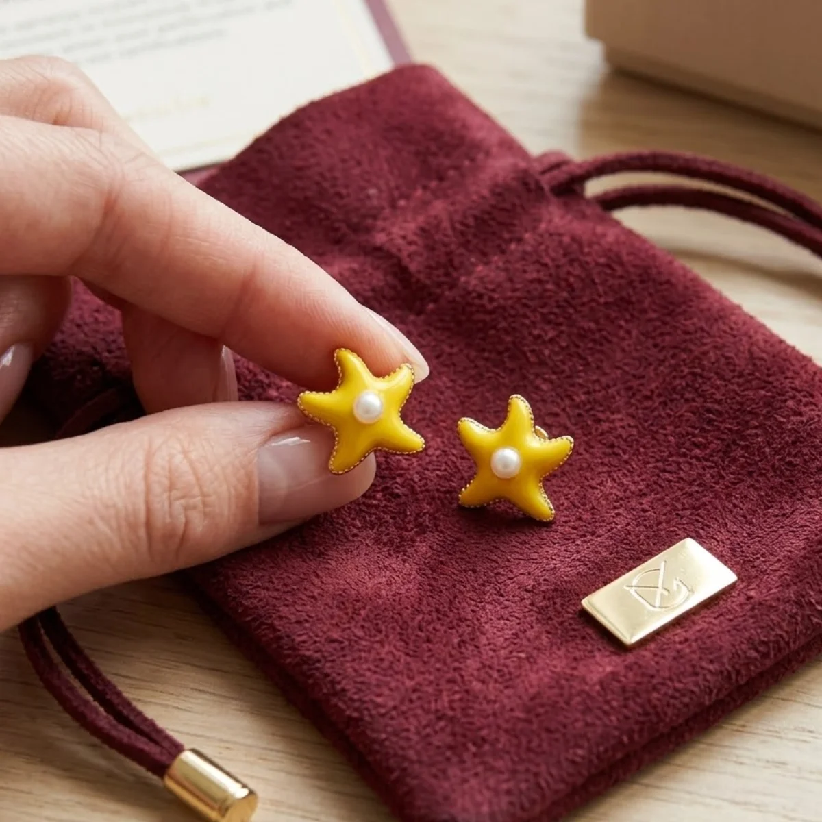 Baza tego filigranowego projektu (10/11 mm) to urocza rozgwiazda, której powierzchnia została ręcznie wypełniona najwyższej jakości jubilerską emalią. Głęboki, cytrynowo-słoneczny odcień żółci fenomenalnie kontrastuje z opaloną skórą, przyciągając spojrzenia. Maleńka, złota gwiazdka ukryta w samym sercu rozgwiazdy oraz lśniące, pozłacane ranty dodają kolczykom elegancji i trójwymiarowości.