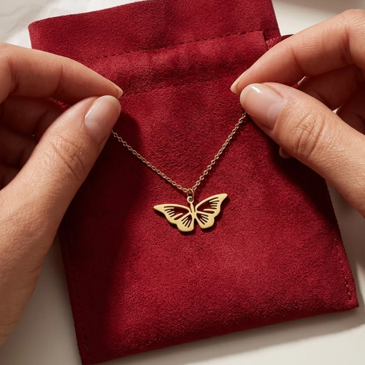 Celebrujemy każdy detal. Twój nowy naszyjnik spocznie na gładkiej, czerwonej zamszowej saszetce wewnątrz całkowicie minimalistycznego opakowania bez zbędnych nazw i logotypów. To Royal Service, który stawia produkt i Twoje wrażenia na pierwszym miejscu.