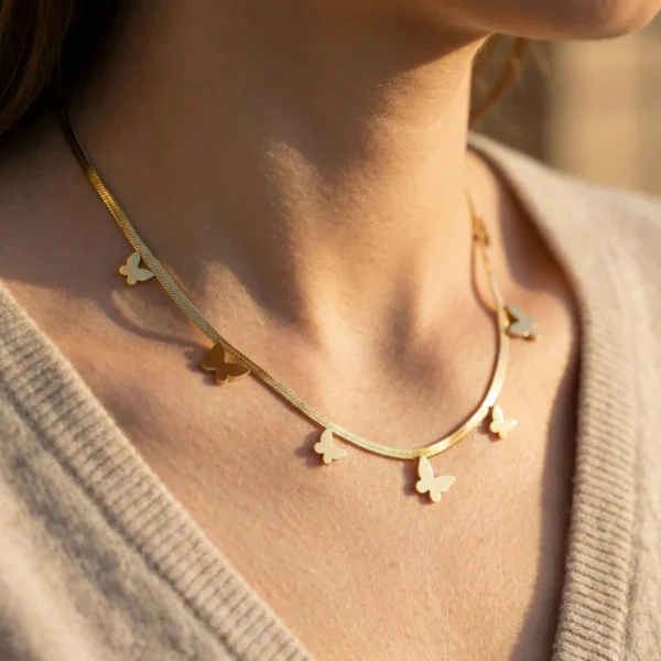 Bazą jest tutaj łańcuszek o splocie Herringbone / Snake (Żmijka). Jego struktura jest idealnie płaska i gładka, dzięki czemu układa się na skórze jak wstążka z płynnego metalu, niesamowicie odbijając światło. Wzdłuż łańcuszka rozmieszczono symetrycznie złote motyle. Są one integralną częścią kompozycji – poruszają się razem z Tobą, dodając stylizacji lekkości i dynamiki.